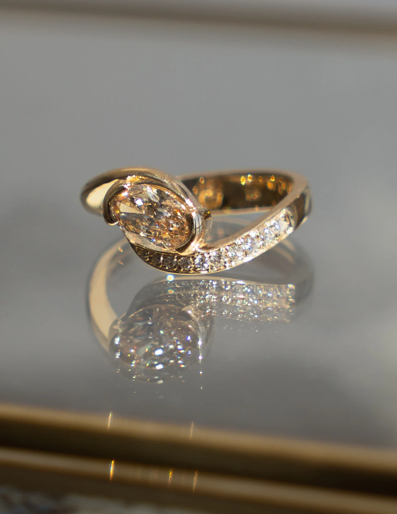 This breathtaking Rapture™ ring embodies a soulful warmth and elegance, as well as the beauty of harmony. It showcases a brilliant CHAMPAGNE oval diamond set within our Demi Pavé Rapture™ design: an ocean-inspired silhouette with one side illuminated by shimmering white diamonds, creating an asymmetrical allure. A true modern heirloom that is artful yet timeless.