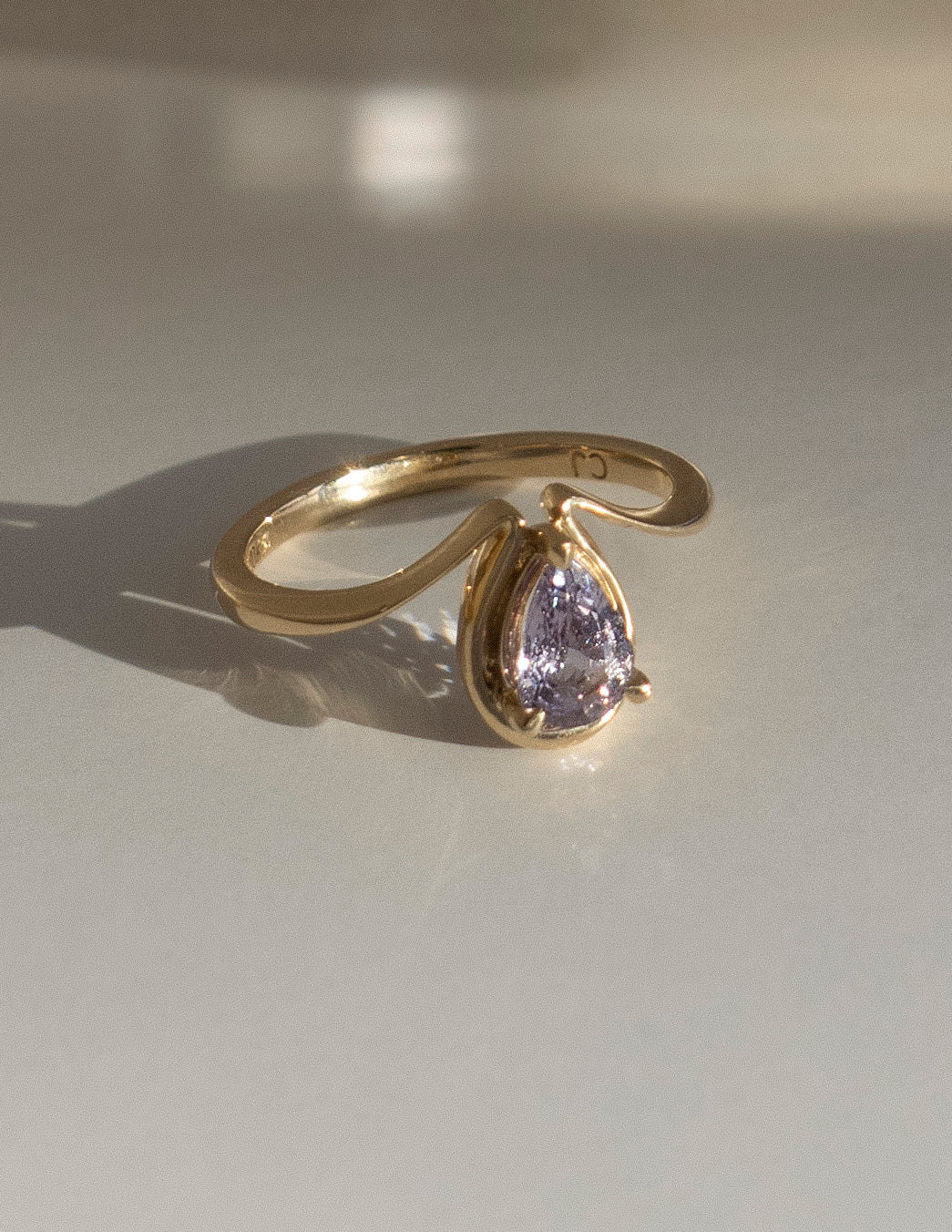 This one-of-a-kind ring features a rare and stunning natural pastel lavender sapphire set within Cadette's signature TALIA design: a fluid silhouette that emulates both a dew drop and budding flower; symbols of a radiant new beginning. Unlike any other, this unique Nature-inspired design makes a statement, while also being sleek and timeless with its minimally flowing lines that wrap around the sparkling pear sapphire.