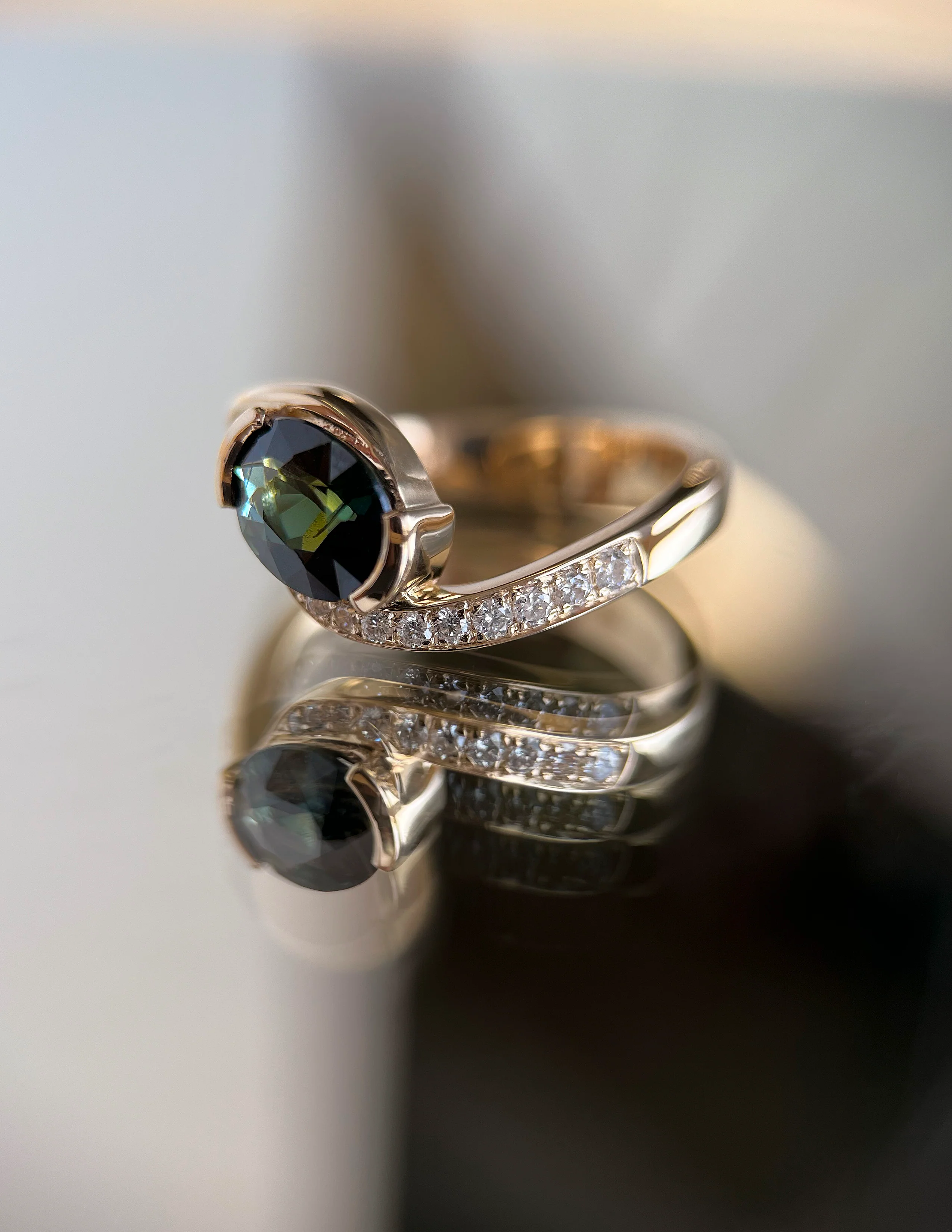 One-of-a-kind — 1.34CT Green-Blue Oval Sapphire Demi Pavé Rapture Ring