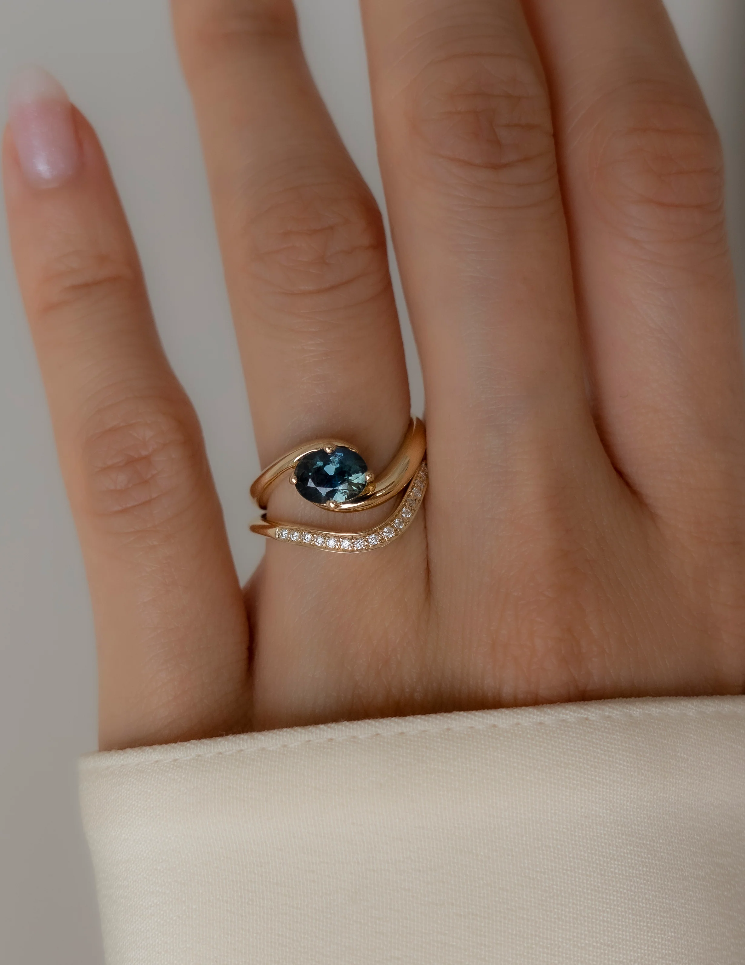 A one-of-a-kind oceanic ring that showcases a stunning Australian teal sapphire set within Cadette's signature OVAL Rapture™ design: an artfully bold and unique silhouette that expresses the flow and fluidity of water. This sublime sapphire exudes an alluring teal blue hue, calling to mind the the majesty and magic of the ocean waters. This ring dances elegantly atop your finger as you wear it, radiating a modern timelessness.