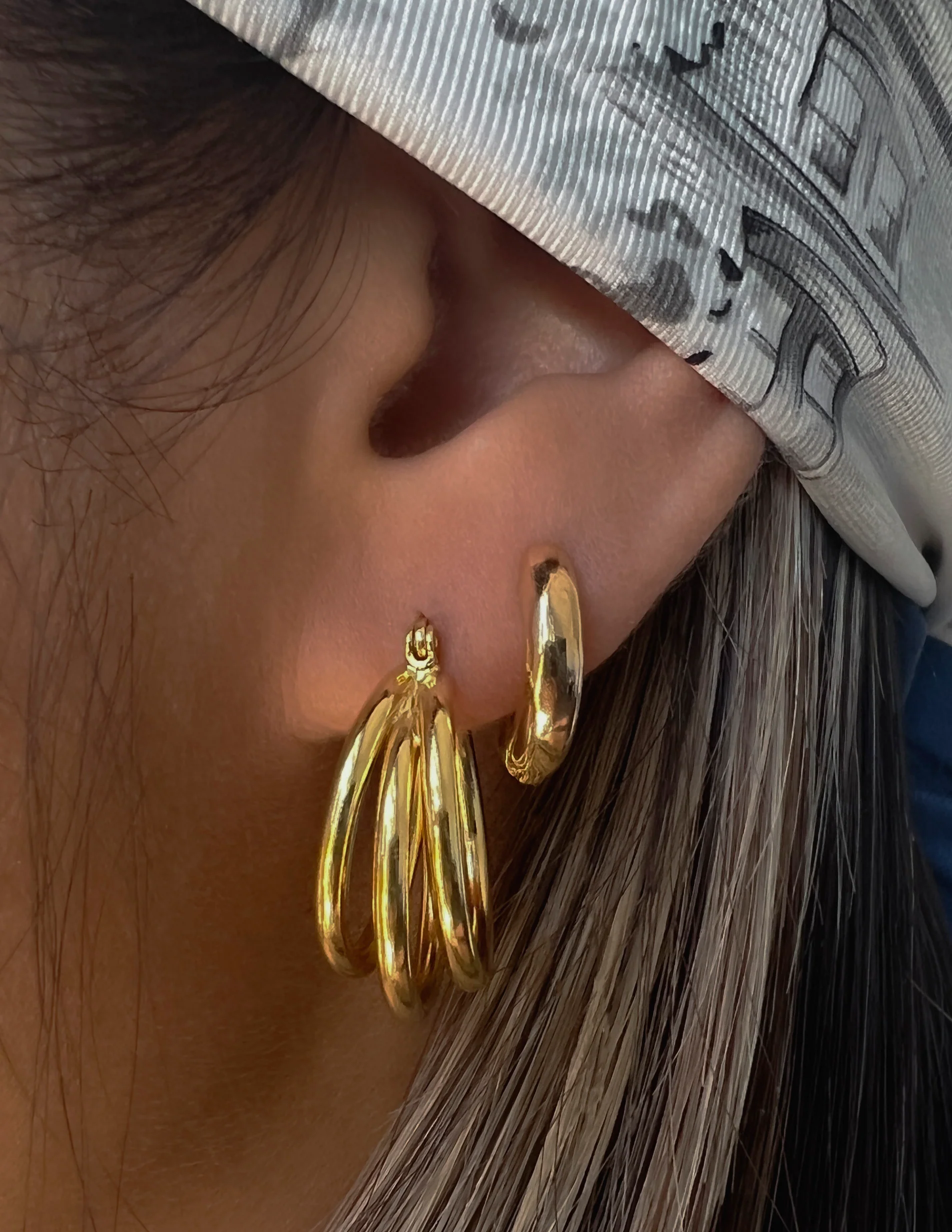 Rounded trio hoops fanned out in an eye-catching way. They are stylish, effortless and comfortable on the ears. A timeless style that elevates any look you wear them with, from casual to formal.